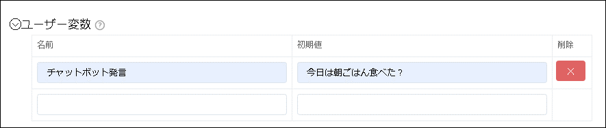 手順としてはチャットボットのメイン画面の「ユーザー変数」セクションで下記のように設定します。初期値にはユーザへの最初のチャットボットの発言を格納しておきます。