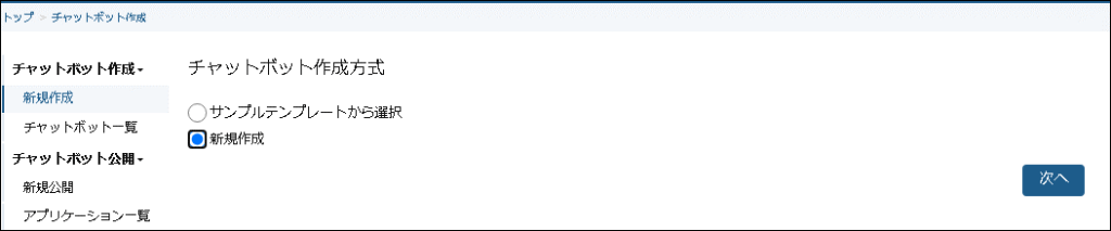 DialogPlayにログインしサイドメニューの「チャットボット作成」-「新規作成」を選択します。「新規作成」を選択して「次へ」ボタンを押下します。