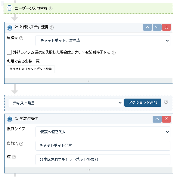 最後に、外部システム連携を呼び出し、生成されたチャットボットの発言を変数に格納するアクションを追加します。上で設定したヒアリングのアクションに続けて下記画像のように「2:外部システム連携」と「3:変数の操作」のアクションを設定します。