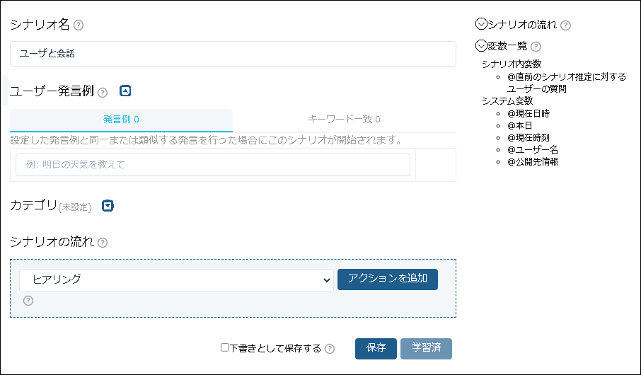 | ヒアリング項目名 | ユーザ発言 | ユーザが入力した発言が「ユーザ発言」という変数に格納されます。 |