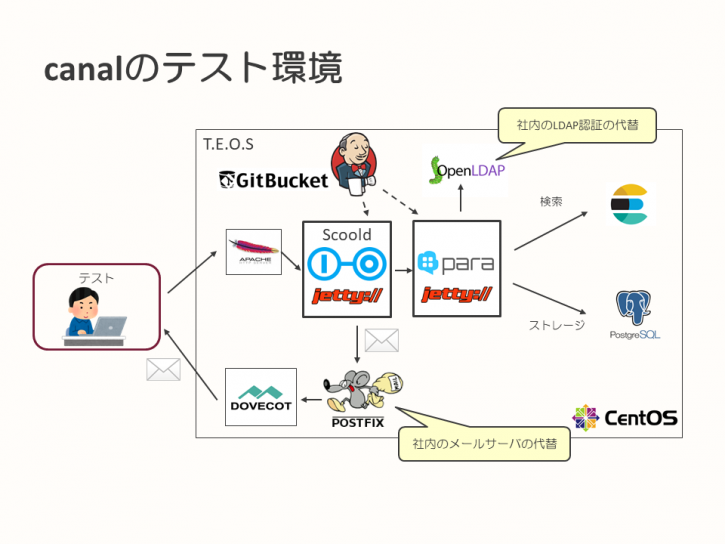 テスト環境においては、LDAP認証はOpenLDAPに、メール送信に使うサーバはPostfixとしています。また、ソースコードはGitBucket管理、テスト環境へのデプロイはJenkinsで実施しており、これらはすべてテスト環境に同居しています。